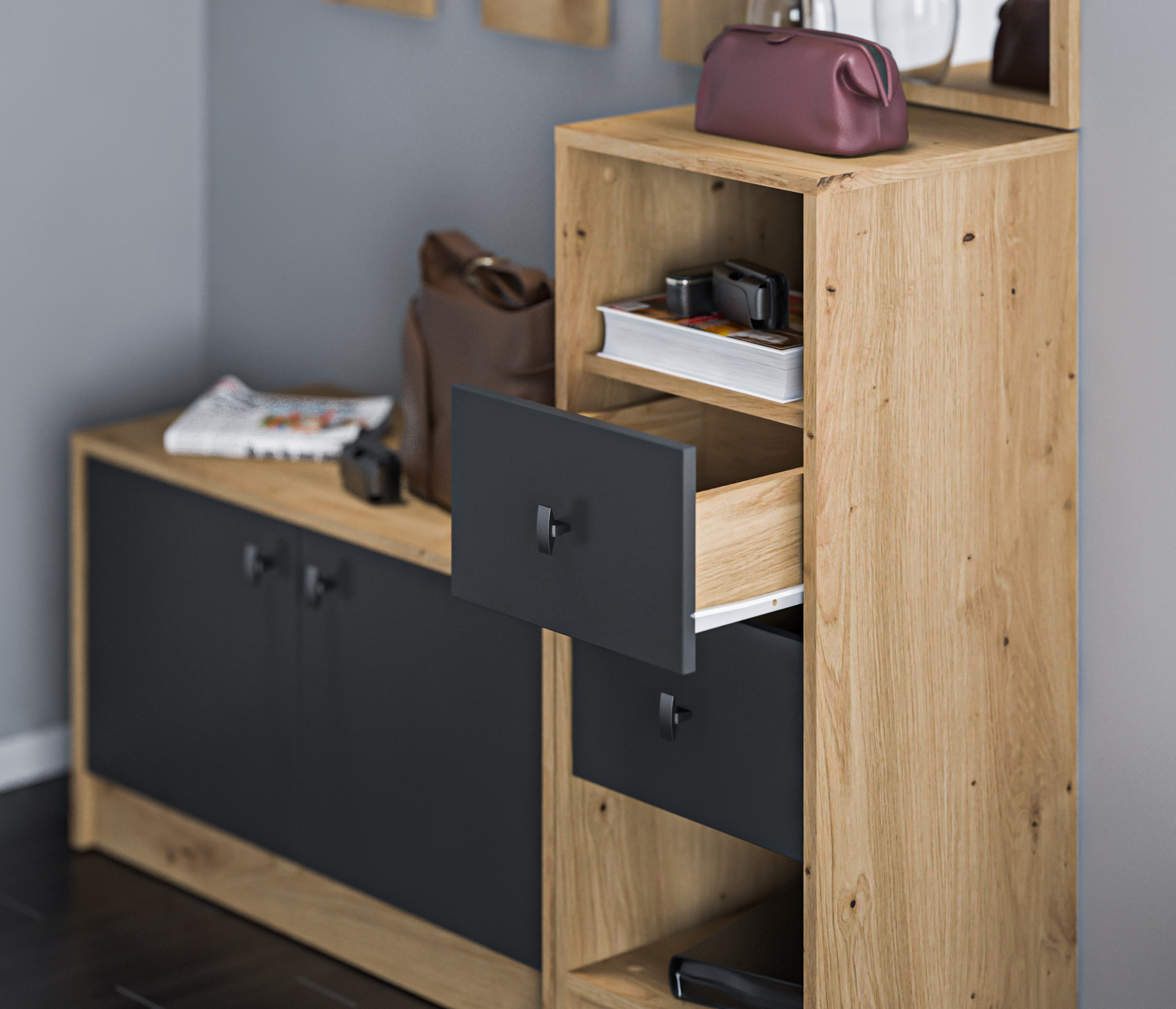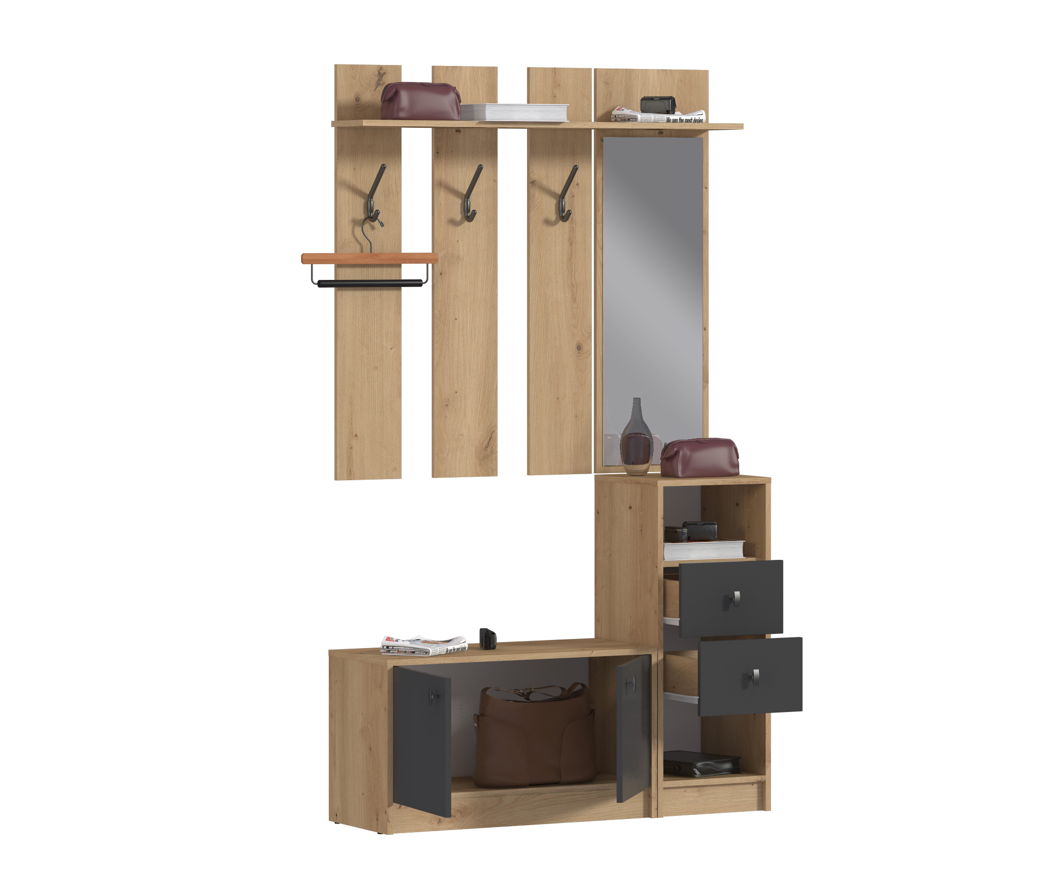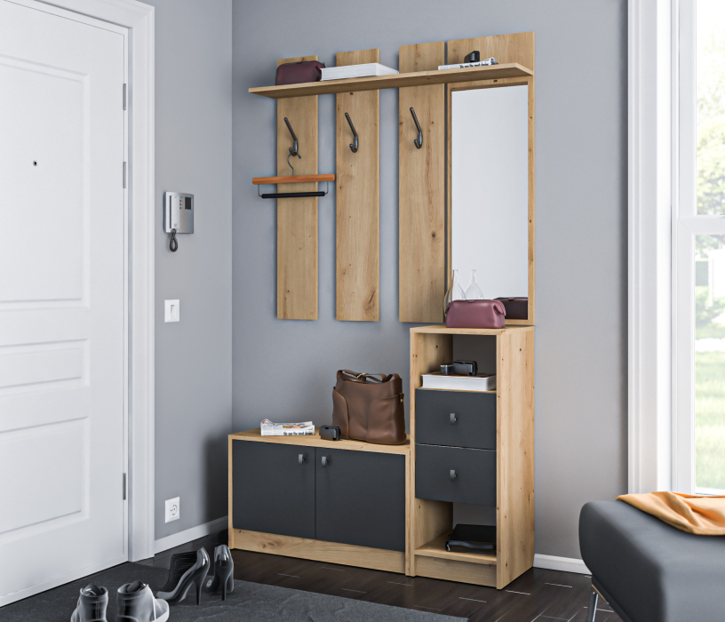 Модульная конструкция "Сидней" разработана для небольших помещений. Каждый модуль оптимизирован для экономии места, предлагая максимальную функциональность на минимальной площади. Вы можете создать свой собственный вариант прихожей, подбирая модули в соответствии с вашими потребностями и предпочтениями.