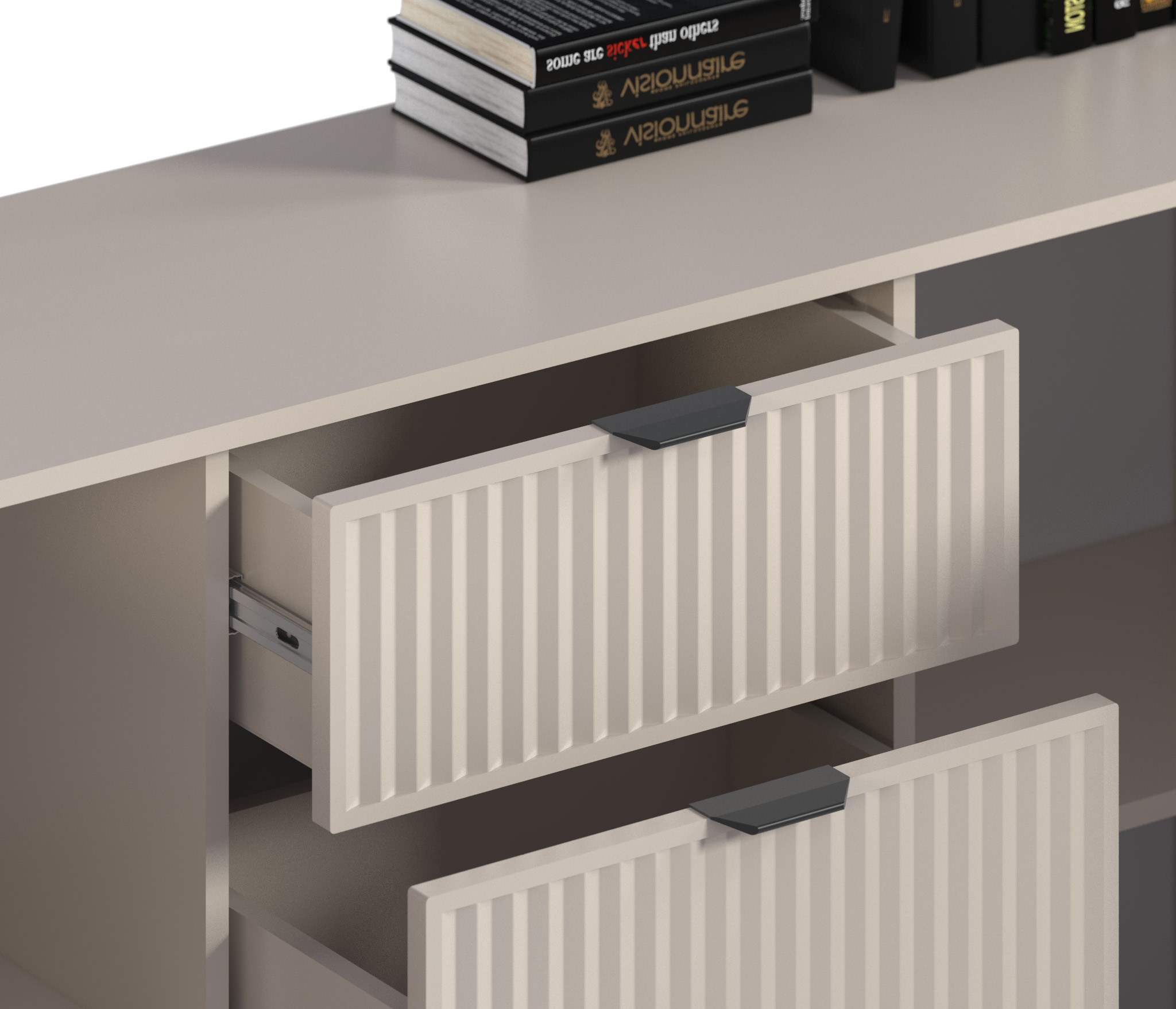 Качественная фурнитура со встроенными доводчиками позволяет плавно открывать, закрывать двери и ящики. Направляющие шариковые полного выдвижения.
