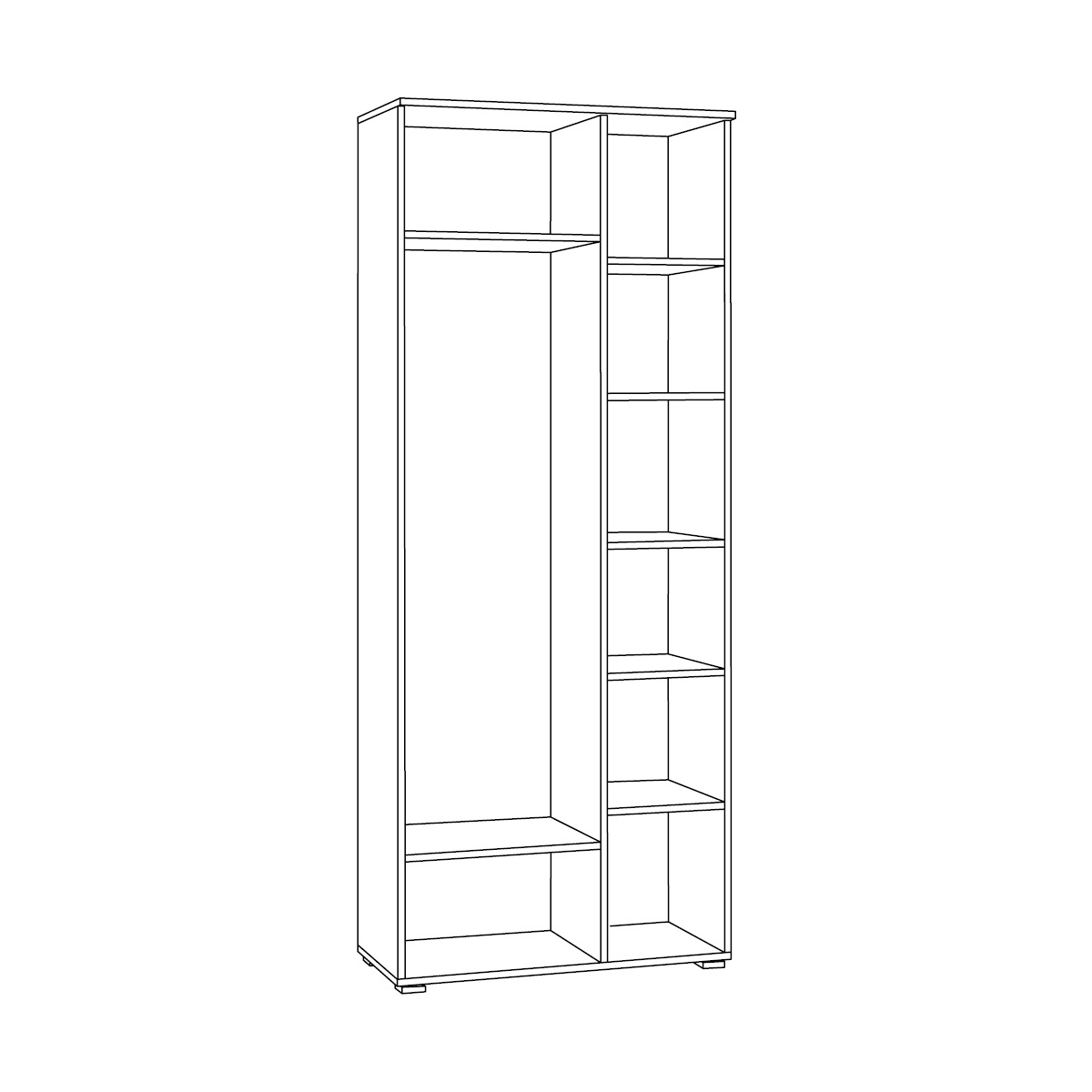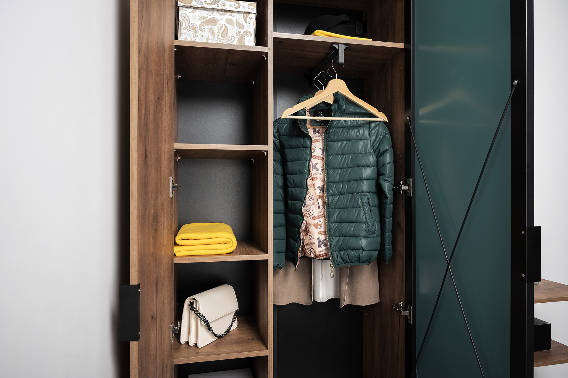 Выдвижная усиленная штанга в шкафу обеспечивает компактное хранение верхней одежды. Направляющие и петли оснащены доводчиками.