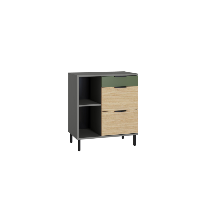 Конструкция с тремя выдвижными ящиками. Ящики разной глубины, установлены на шариковые направляющие полного выдвижения.
