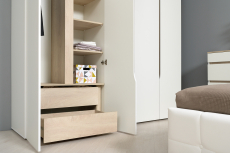 Наполнение шкафа может собрано на любую сторону, два выдвижных ящика скрыты за распашными фасадами, на обратной стороне которых размещается зеркало.