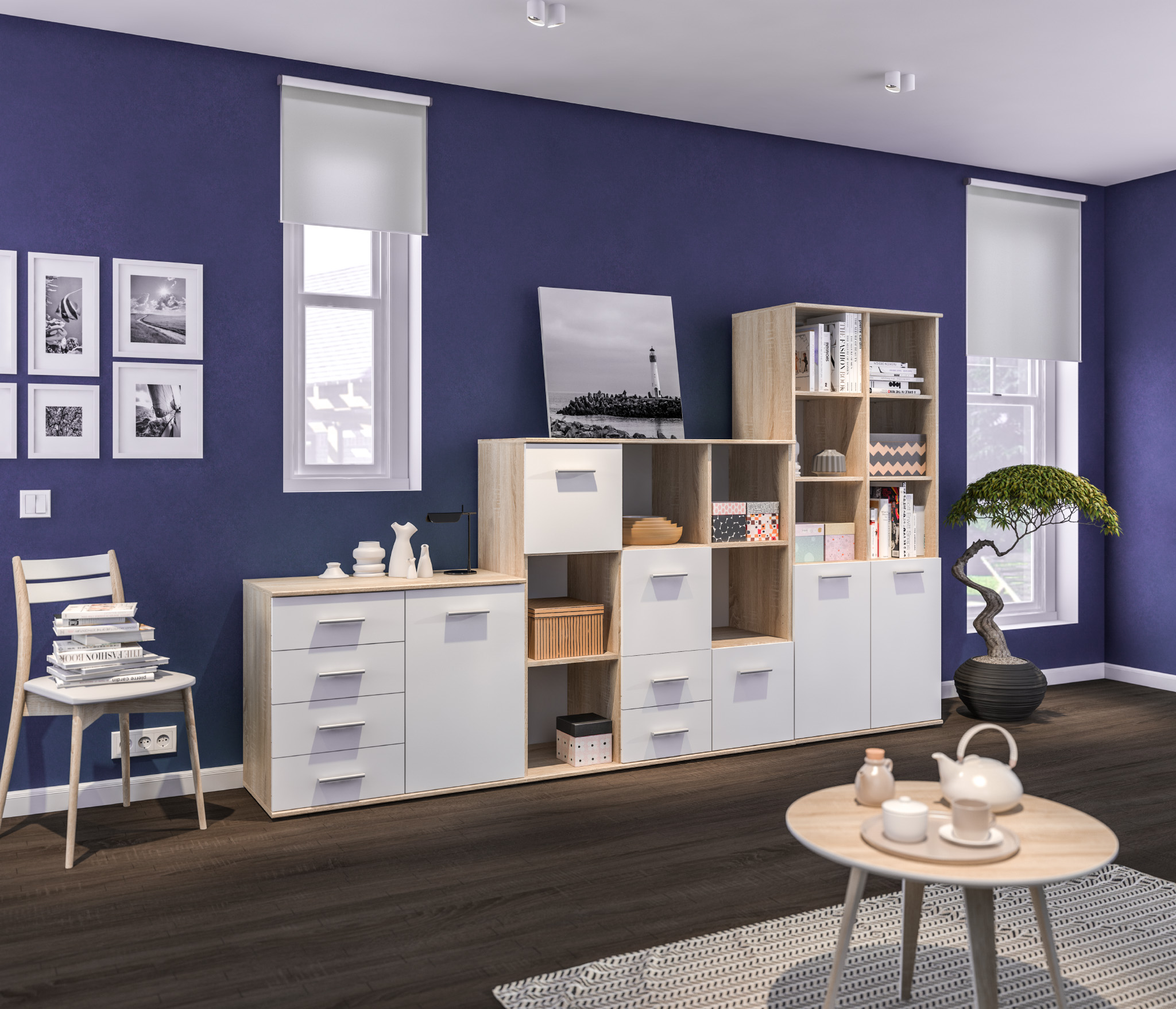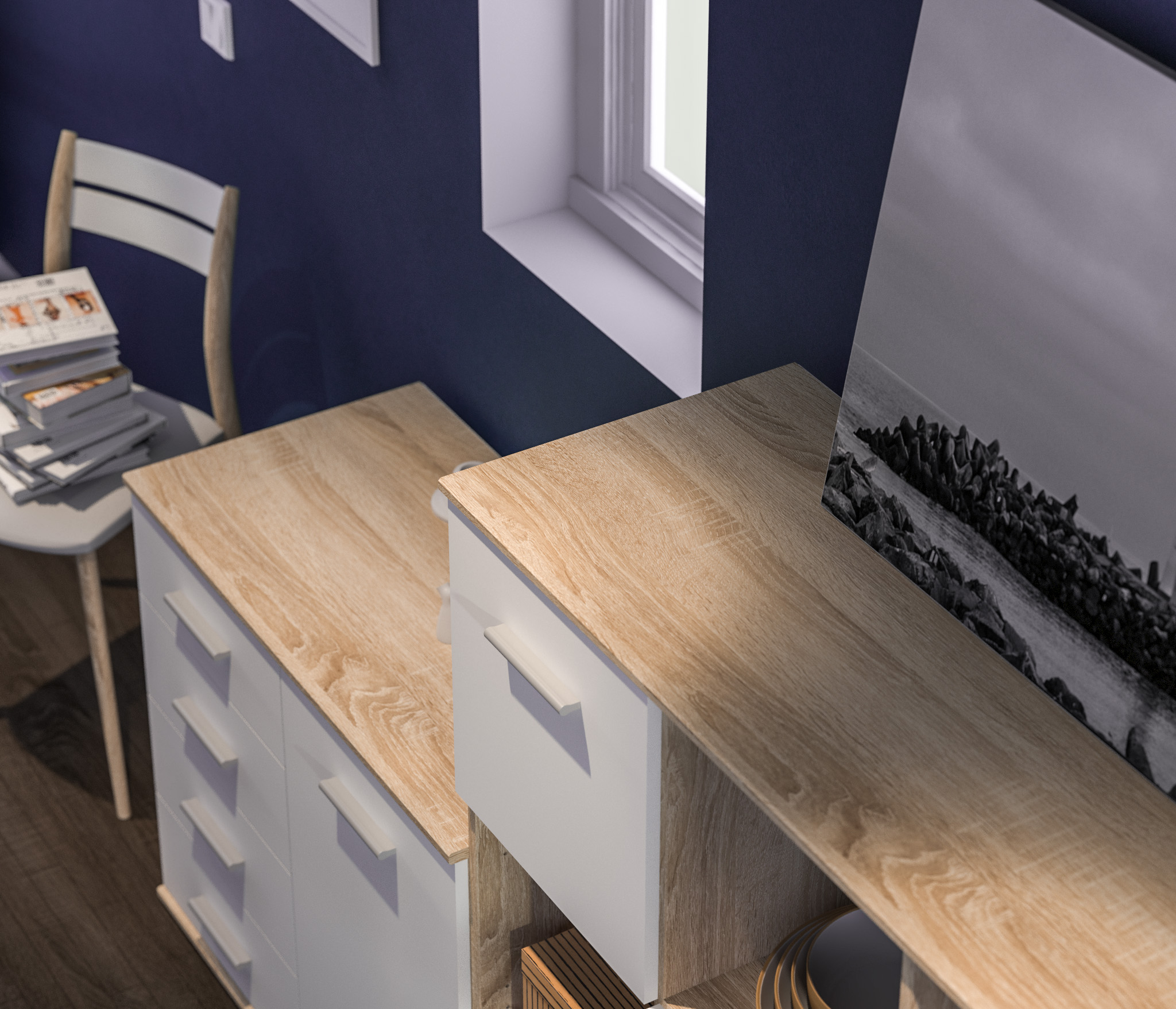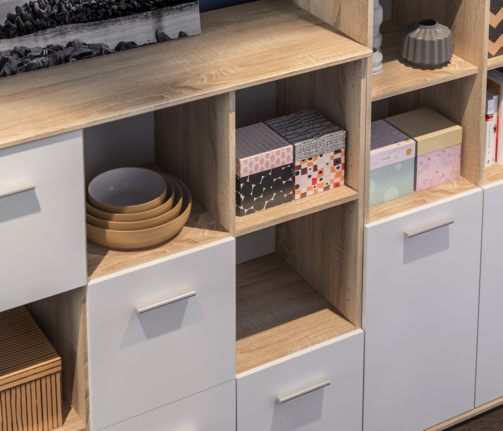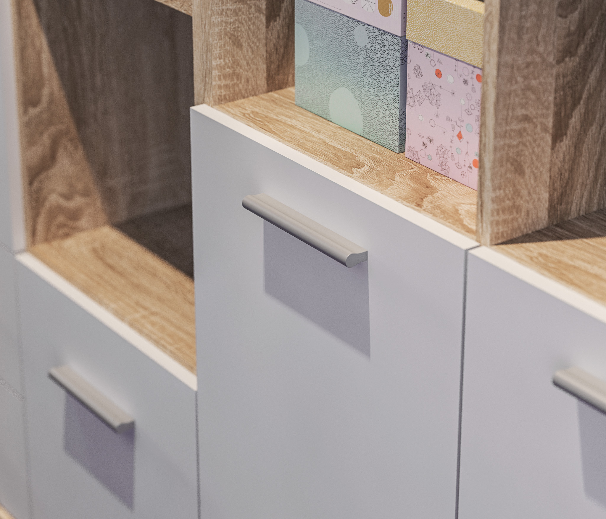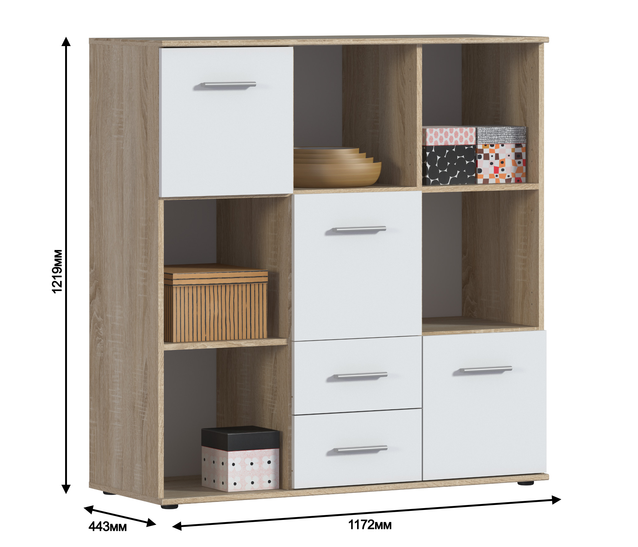Модель производится из современного материала КДСП. Отделка комбинированная – корпус в цвете «Дуб Сонома», фасадные поверхности белые.