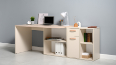 Универсальный стол-трансформер Лайт составит основу комфортного рабочего места дома и в офисе. Данная модель стола может быть собрана и как прямой, и как угловой стол. Стол имеет широкую, глубокую столешницу, один край которой установлен на тумбу. Тумба располагает боковыми открытыми нишами с одной полочкой внутри каждой, и центральным отделением, состоящим из закрытой распашной дверкой нишей и выдвижного ящичка. Стол имеет универсальную сборку и может быть собран на любую сторону. Изготовлен данный стол из ламинированной ДСП 16 мм. и 22 мм., края деталей защищены кромкой ПВХ 0,4 мм. и 2 мм. Распашная дверка закреплена на четырёхшарнирных петлях, выдвижной ящик — на шариковых направляющих. Ручки стола изготовлены из АВS пластика, цвет — сатин. Поставляется стол в разобранном виде, надёжно запакованным, к изделию прилагается инструкция по сборке и необходимая для сборки фурнитура.