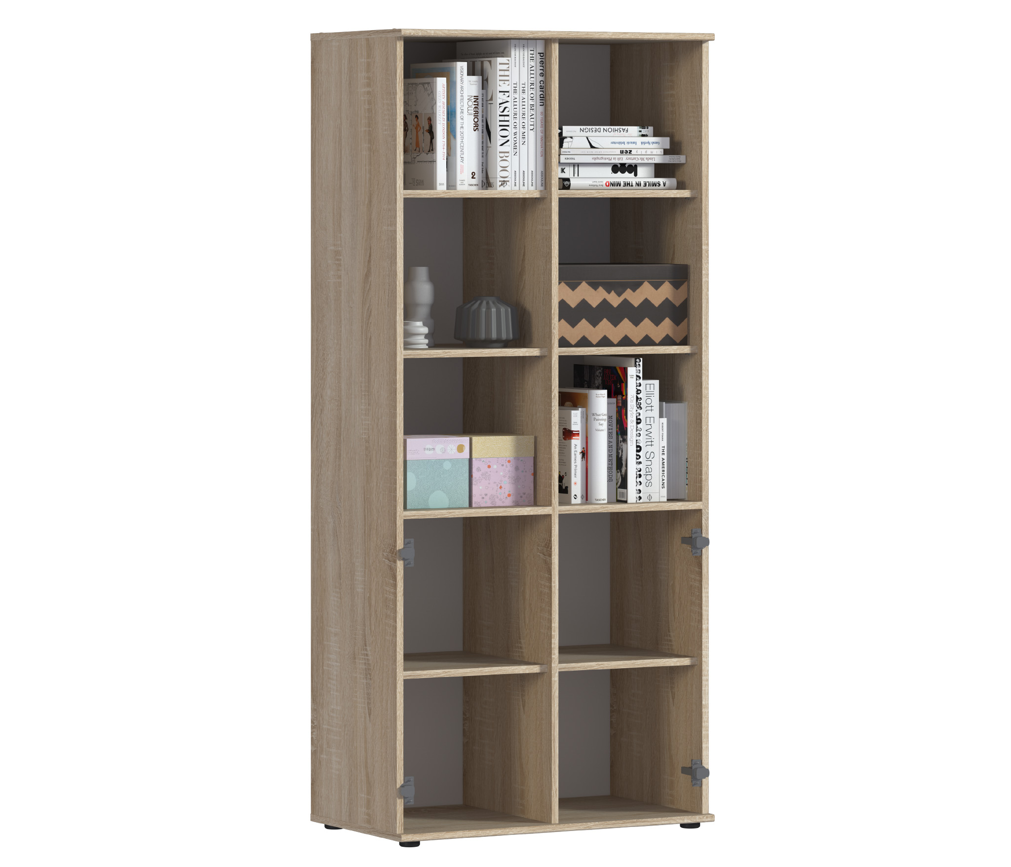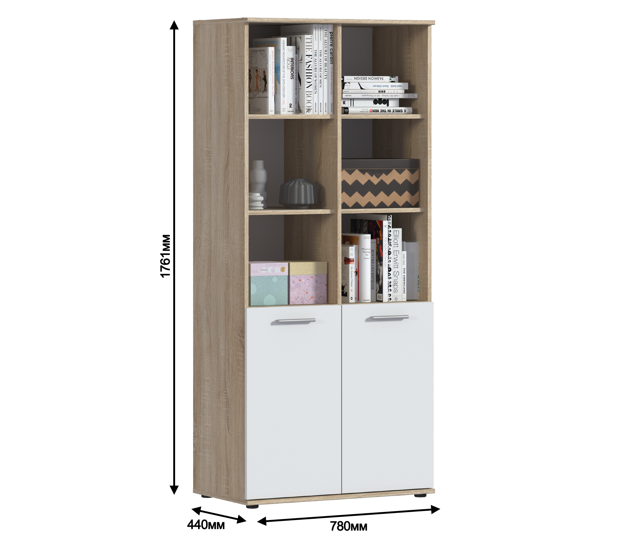 Габаритные размеры – ширина 78 см, высота 176 см и глубина 44 см. Конструктивно стеллаж состоит из нескольких вместительных открытых полок и из отделения с непрозрачными дверцами.Модель производится из современного материала КДСП. Отделка комбинированная – корпус в цвете «Дуб Сонома», фасадные поверхности белые.