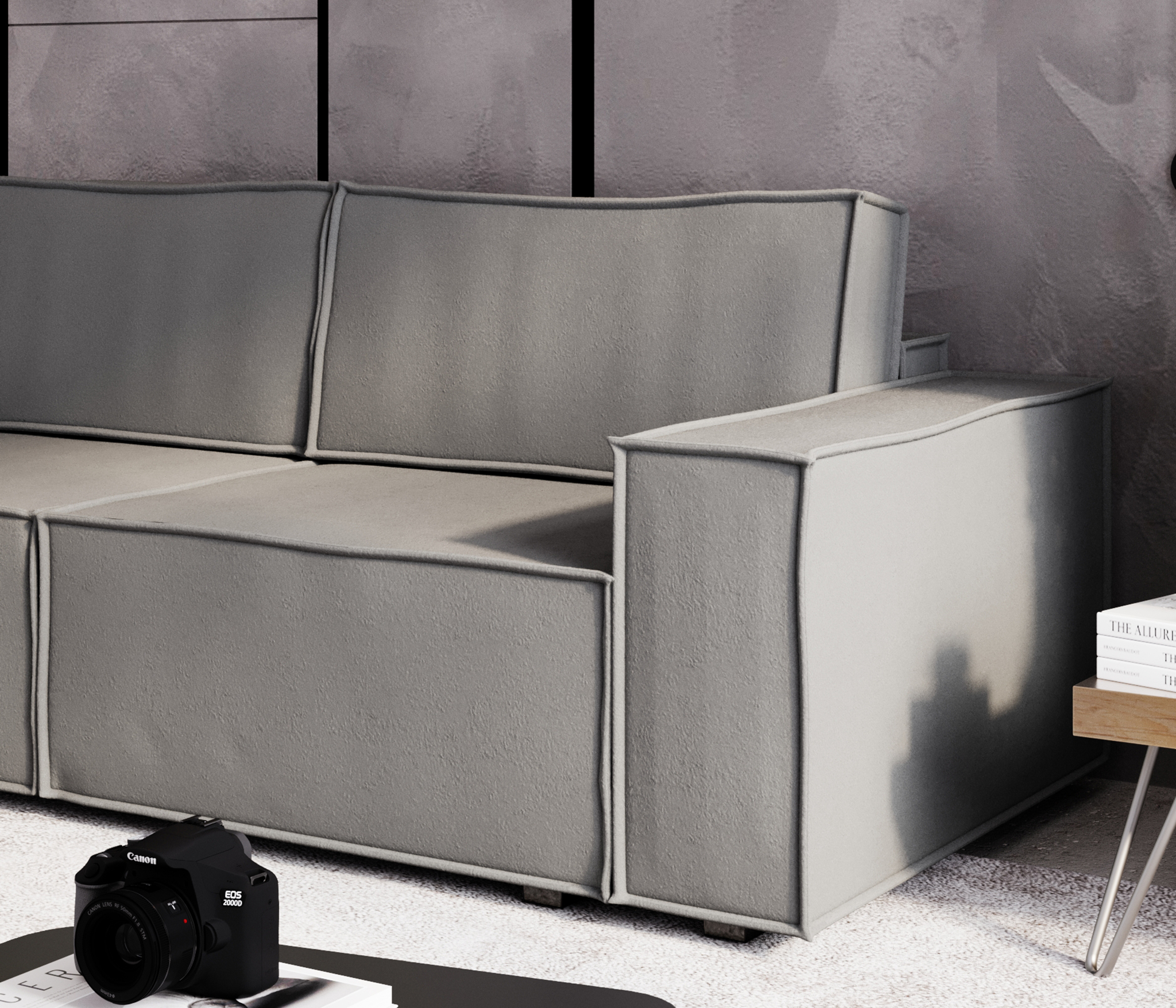 Диван выполнен из однотонного велюра без «пальчикового» эффекта.Antistratching effect позволяет ткани не вытягиваться и долго сохранять первоначальный вид.