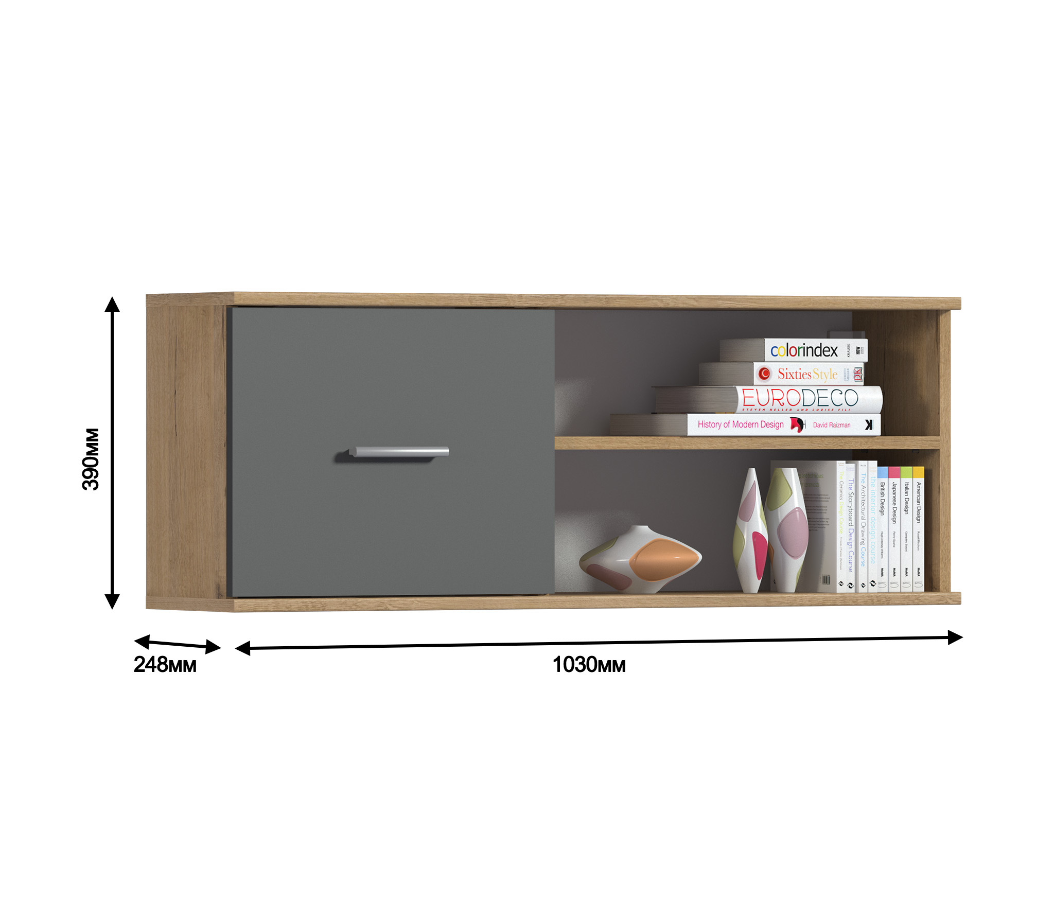 Габаритные размеры – ширина 103 см, высота 39 см и глубина 24 см. Полка состоит из двух открытых отделений, расположенных одно над другим и одного отделения за глухой дверцей.Выполнена полка из современного материала. .Полка крепится к стене при помощи дюбелей, которые входят в комплект.