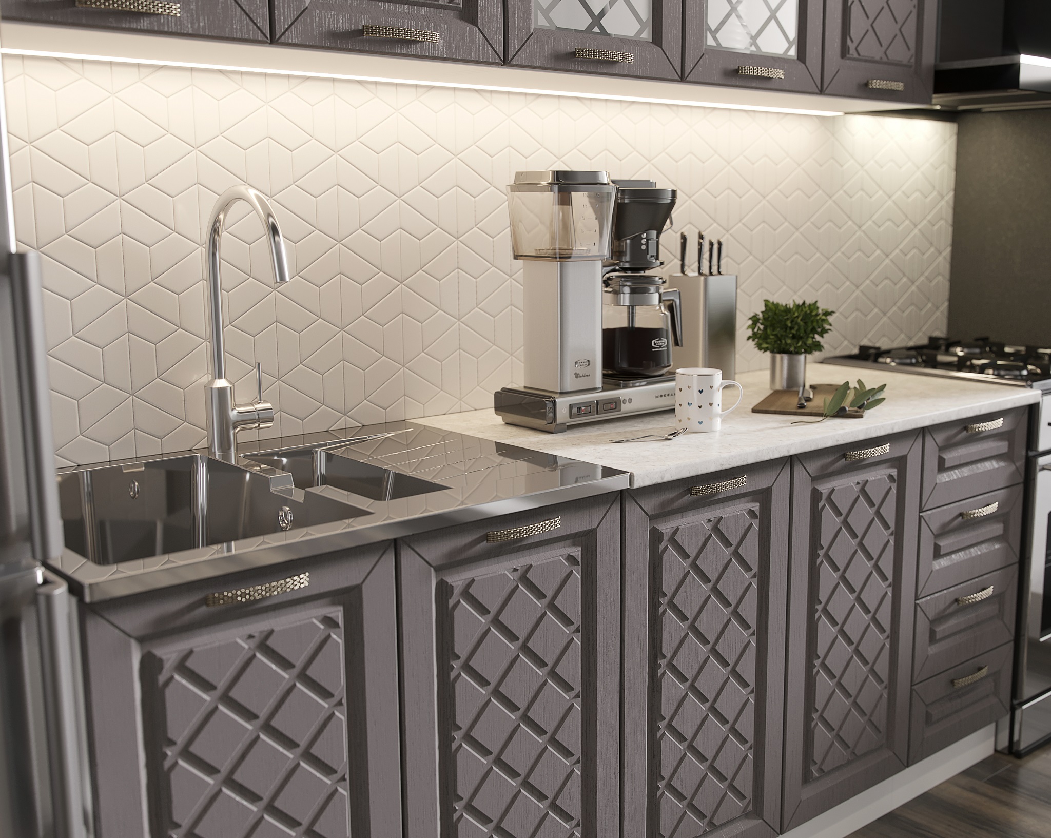 Кухня Агава- изящный гарнитур с фрезеровкой по фасаду и матовыми стёклами.