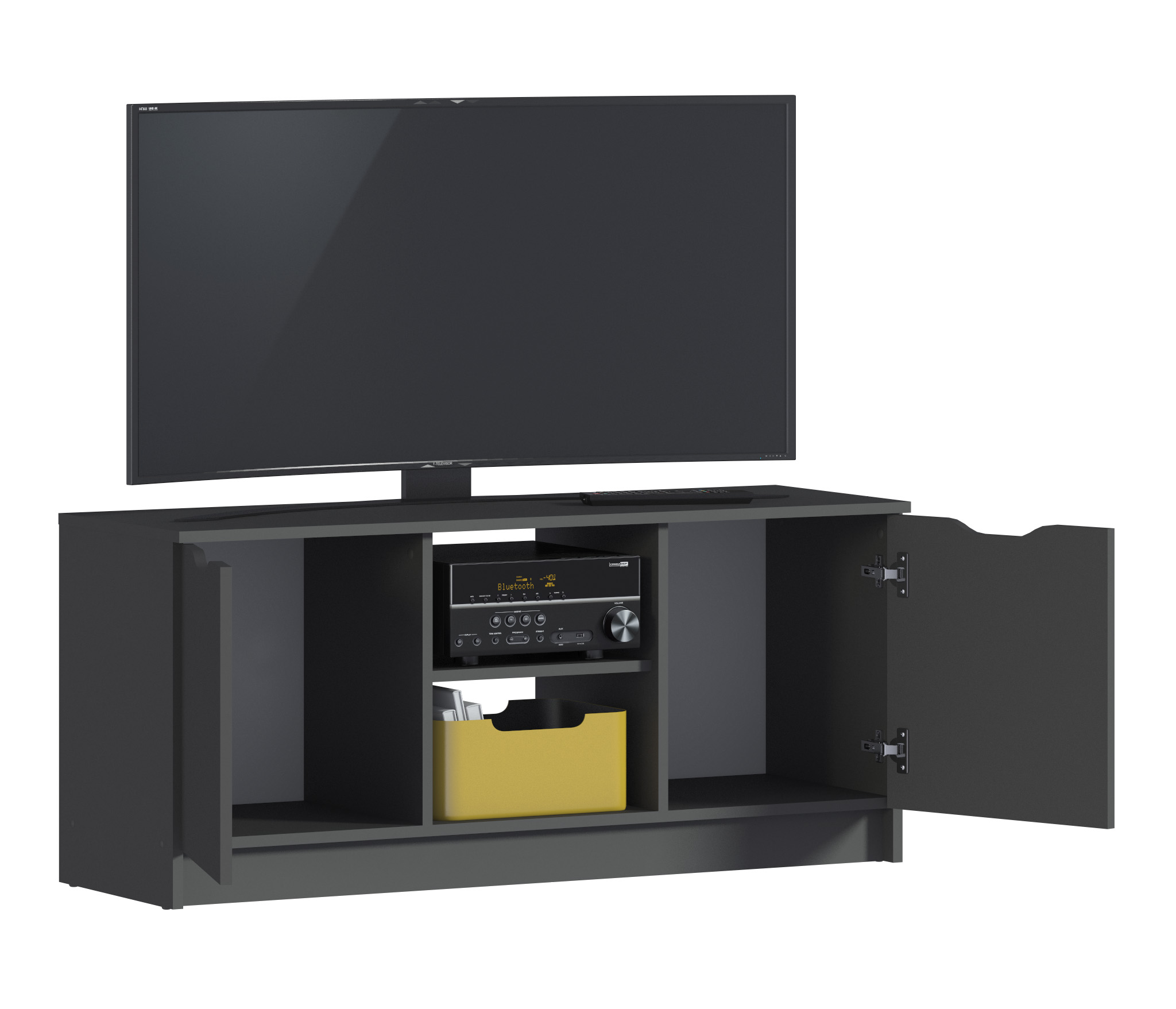 Габаритные размеры – ширина 119, высота 53 см и глубина 39 см. Вес тумбы 24,42 кг, что даёт возможность передвигать её по усмотрению. Визуально тумбу можно разделить на три отделения – открытое центральное с двумя полками для аудио или видео системы и два вместительных отделения с дверцами. Тумба выполнена в минималистичном дизайне из прочного современного материала ЛДСП.