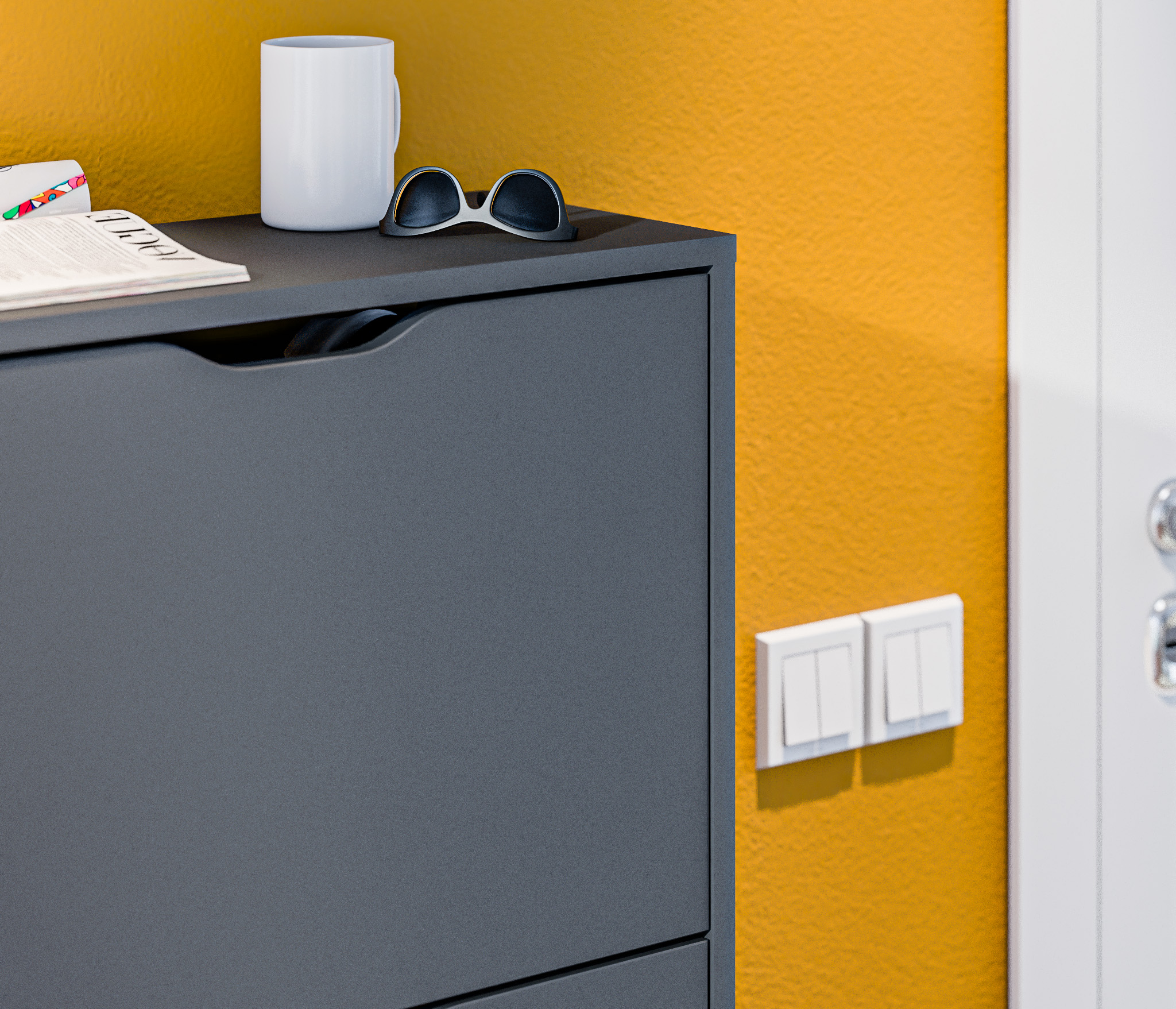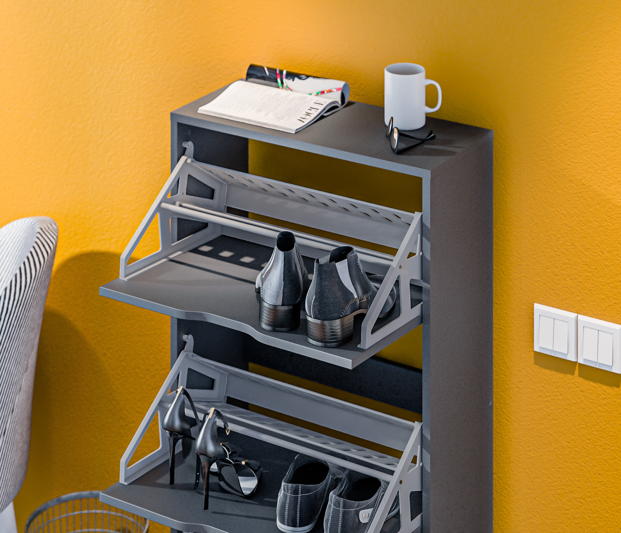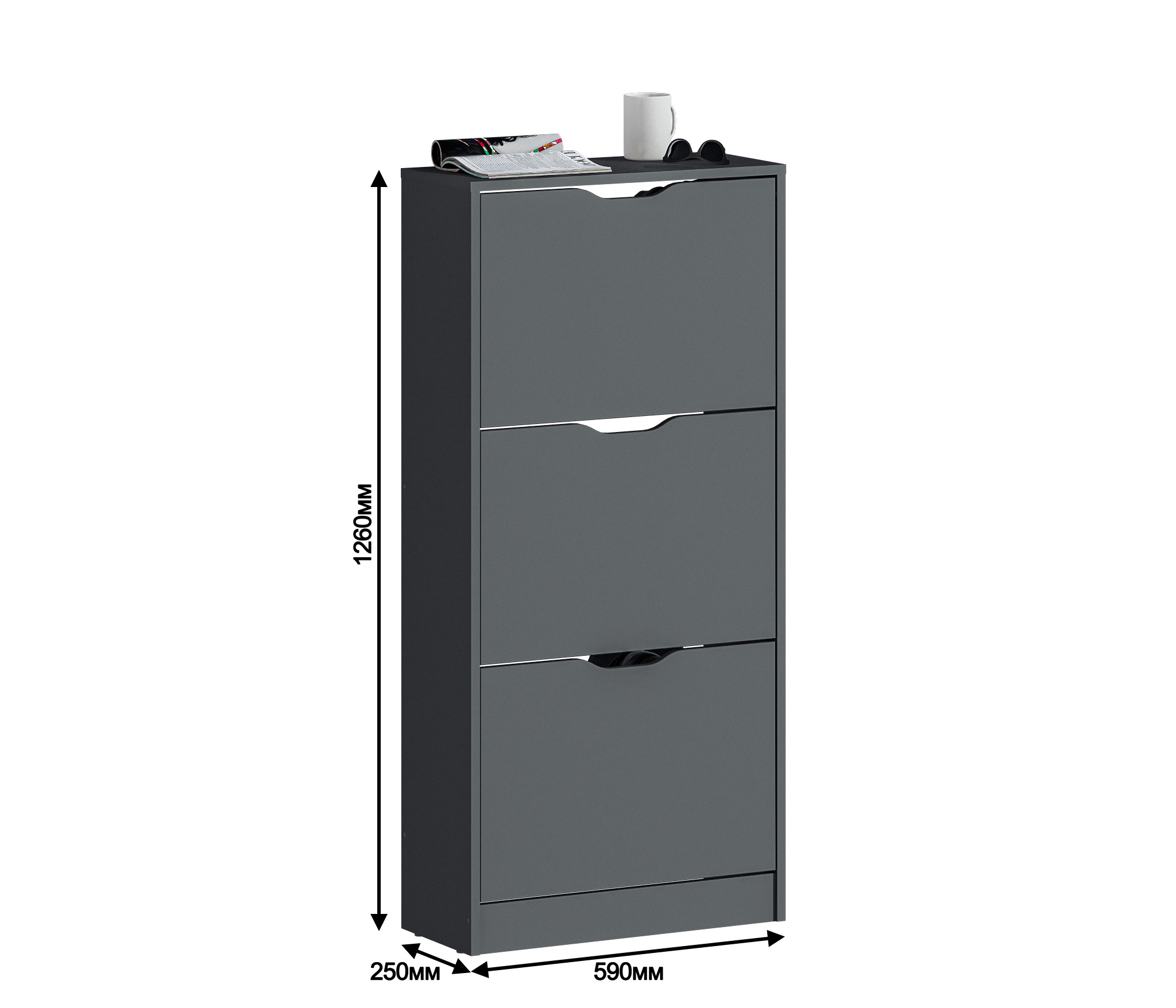 Габаритные размеры – ширина 59 см, высота 126 см и глубина 25 см. Обувница имеет три отделения, каждое из которых оснащено специальными стойками для хранения обуви. Прорезные ручки и строгие геометрические формы позволяют вписать обувницу в любой интерьер. Обувница произведена из экологичного прочного КДСП, устойчивого к мелким механическим повреждениям.