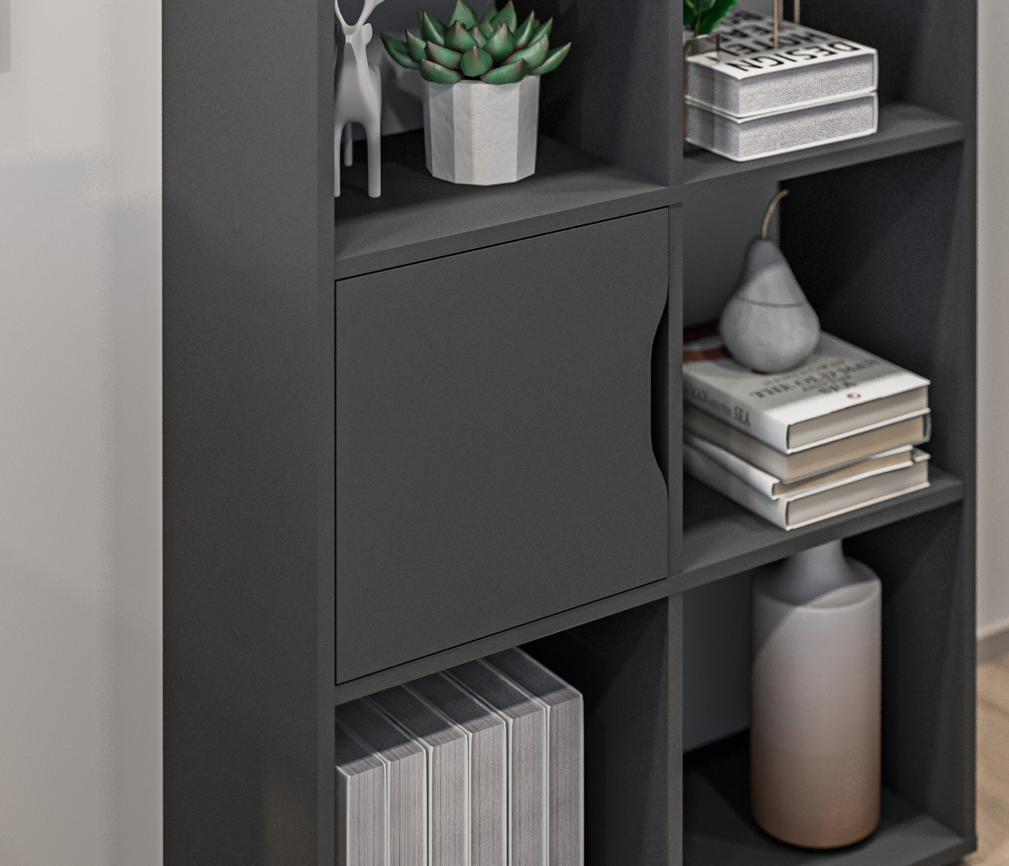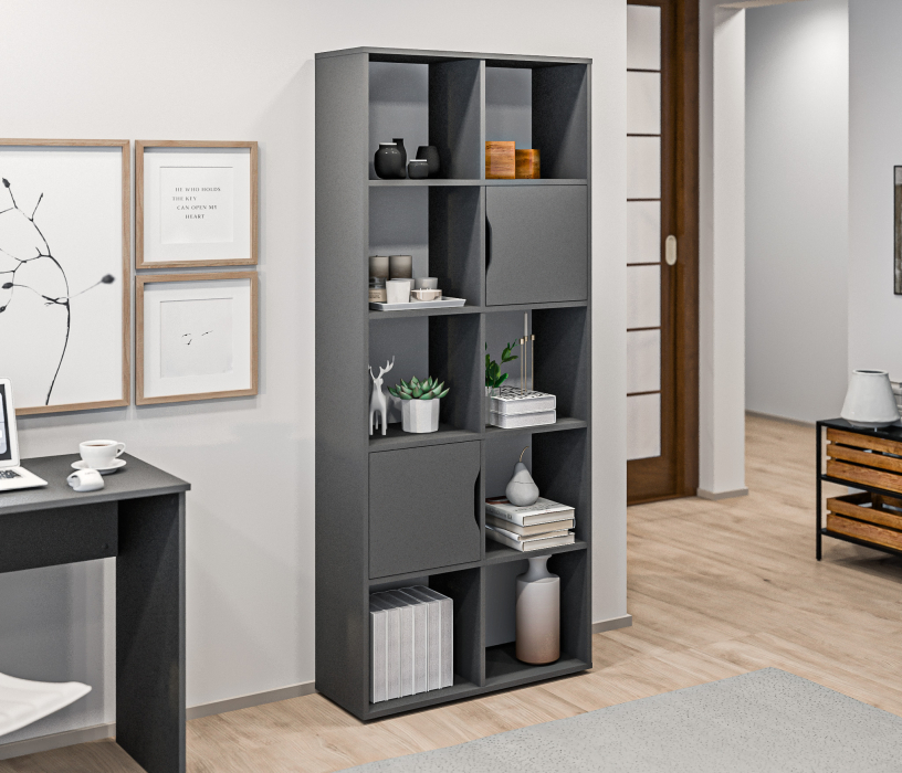 Стеллаж состоит из пяти ярусов и десяти полок, предлагая достаточно места для размещения книг, декоративных предметов, файлов и других вещей. Из этих десяти полок две закрыты дверцами, что позволяет вам хранить предметы вне прямого обзора и обеспечивает защиту от пыли и внешних воздействий.