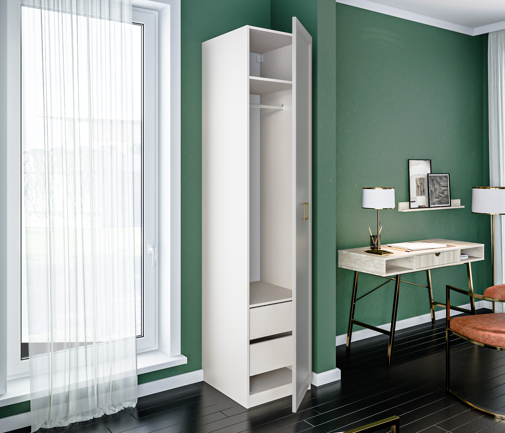 Золотистые ручки и ножки коллекции ""Ассоль"" добавляют неповторимый шик и изысканность, завершая образ тонким и стильным блеском. Эти акценты создают атмосферу роскоши и утонченности. Они играют роль визуального украшения, дополняя общий вид мебели и придавая ей особый шарм и элегантность.